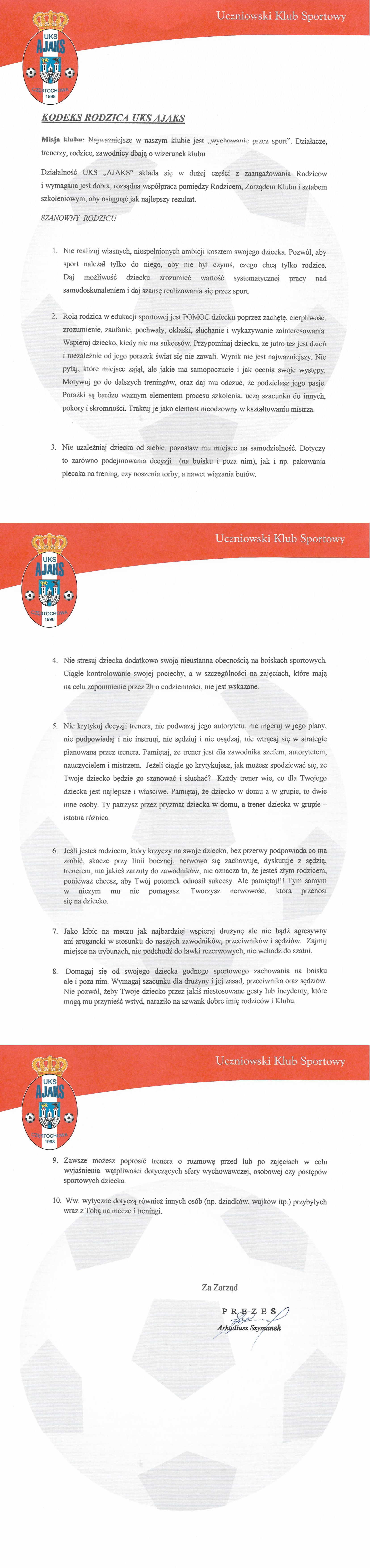 Prosimy o zapoznanie się z kodeksem rodzica zawodników UKS AJAKS.